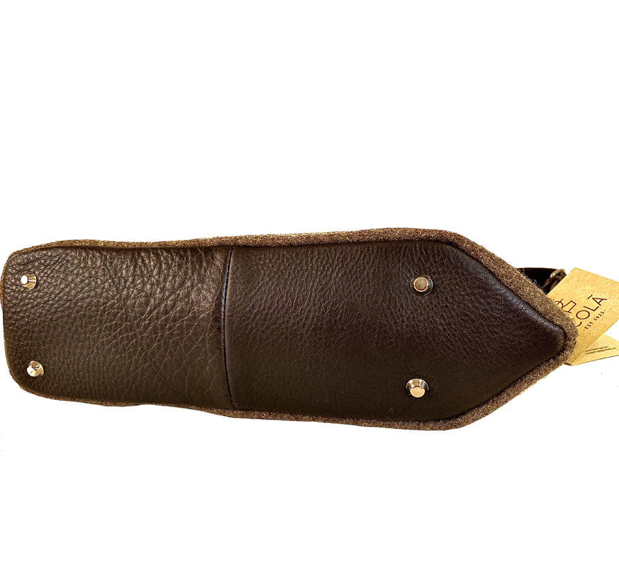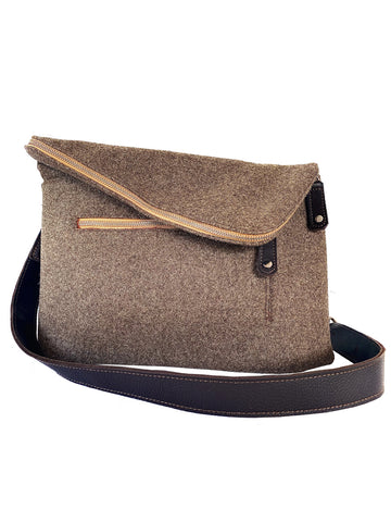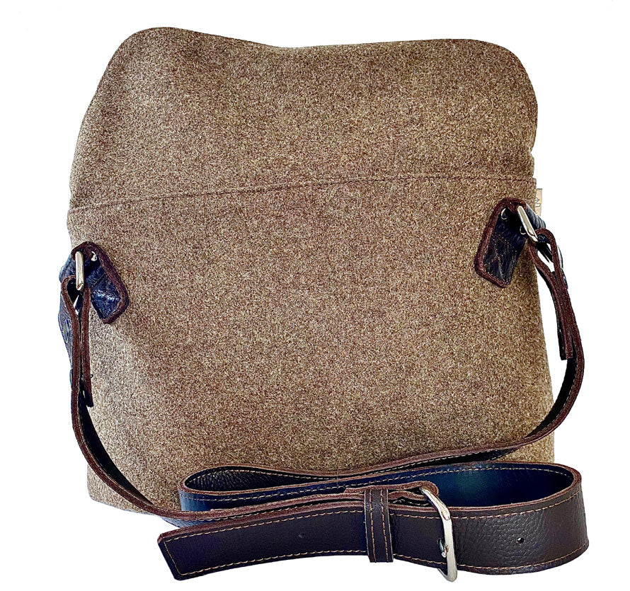 Mala combinada, confecionada em burel com acabamentos em pele. Forrada, com bolso interior. Um bolso exterior. Alça de ombro ajustável. Fecho-éclair.