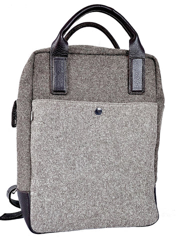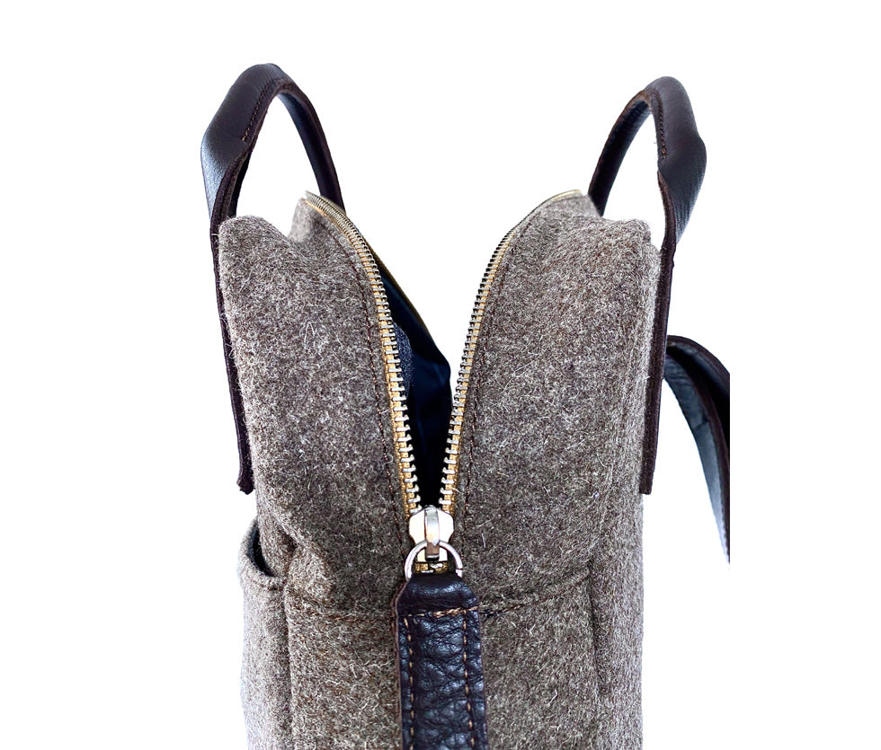 Mochila combinada, confecionada em burel com acabamento em pele. Forrada, com dois bolsos interiores. Um bolso exterior. Pegas de mão na parte superior e alças ajustáveis em pele. Fecho-éclair.