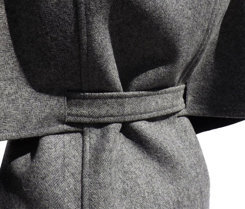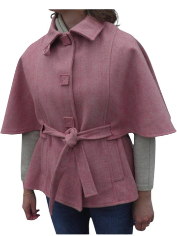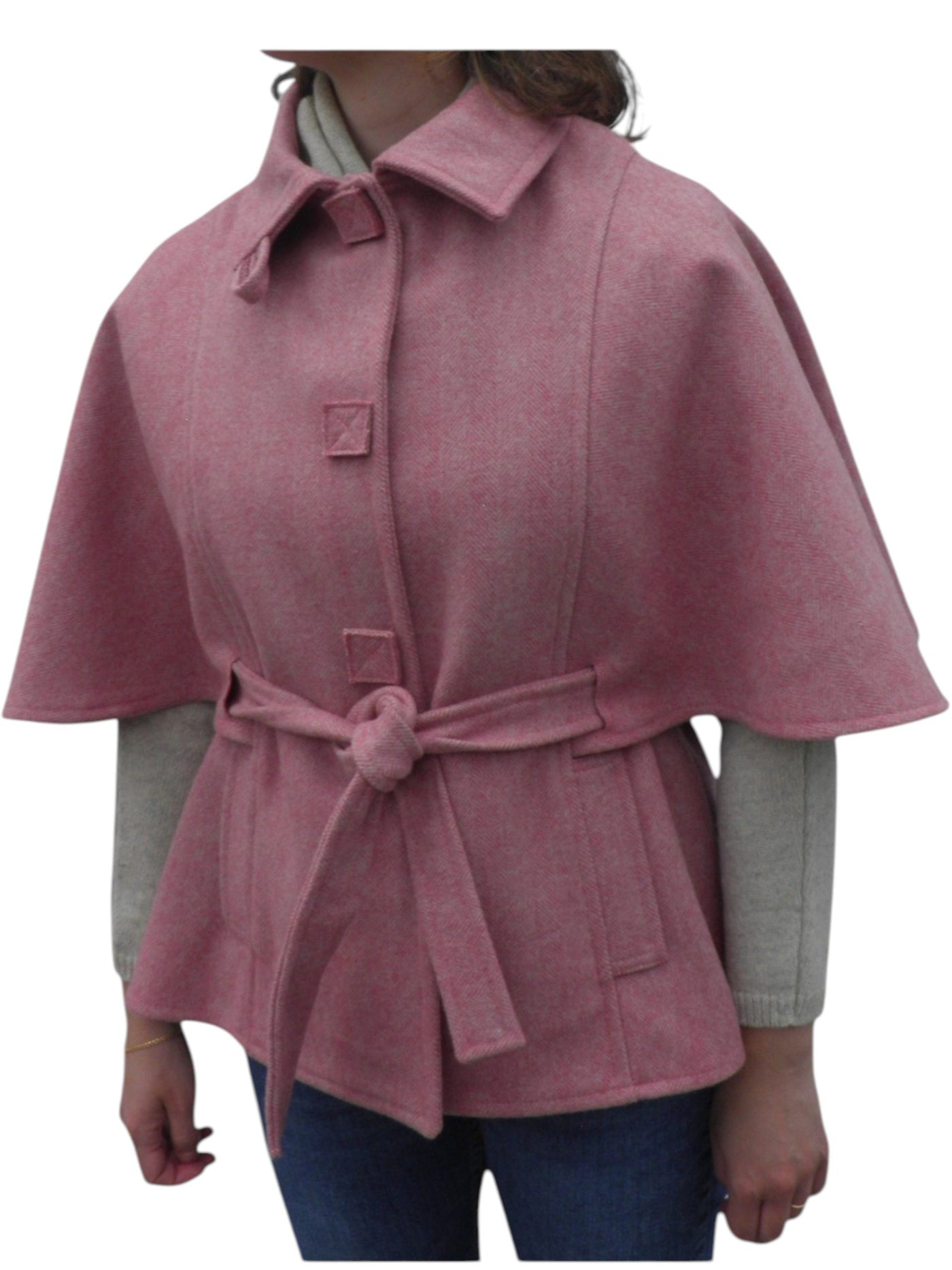 Capa curta confecionada em burel. Manga curta. Fecha com molas ocultas. Cinto ajustável.