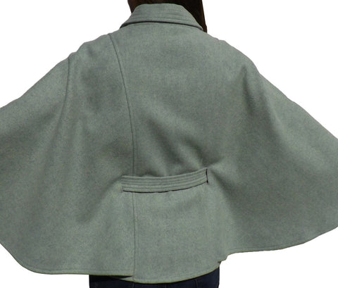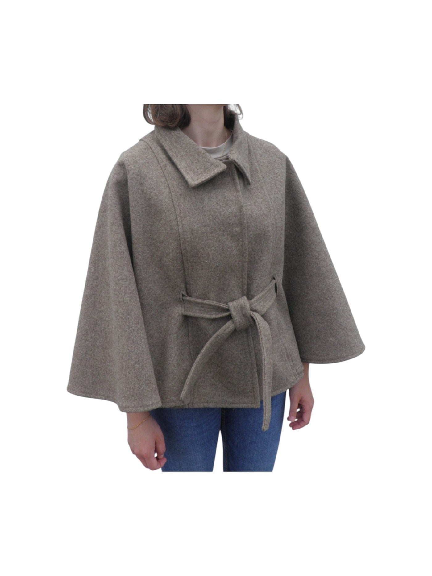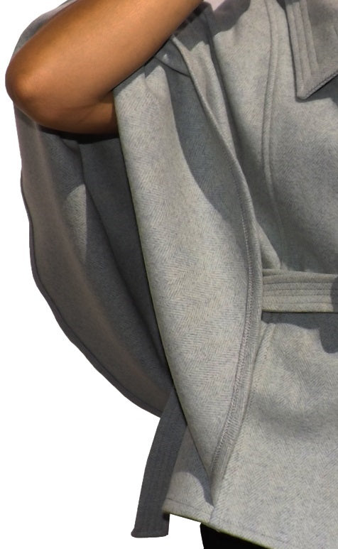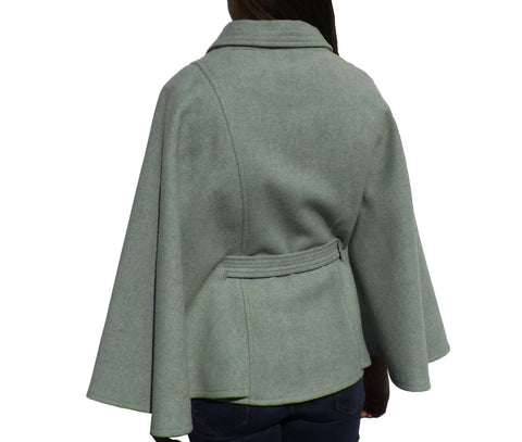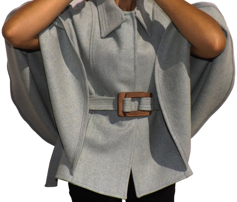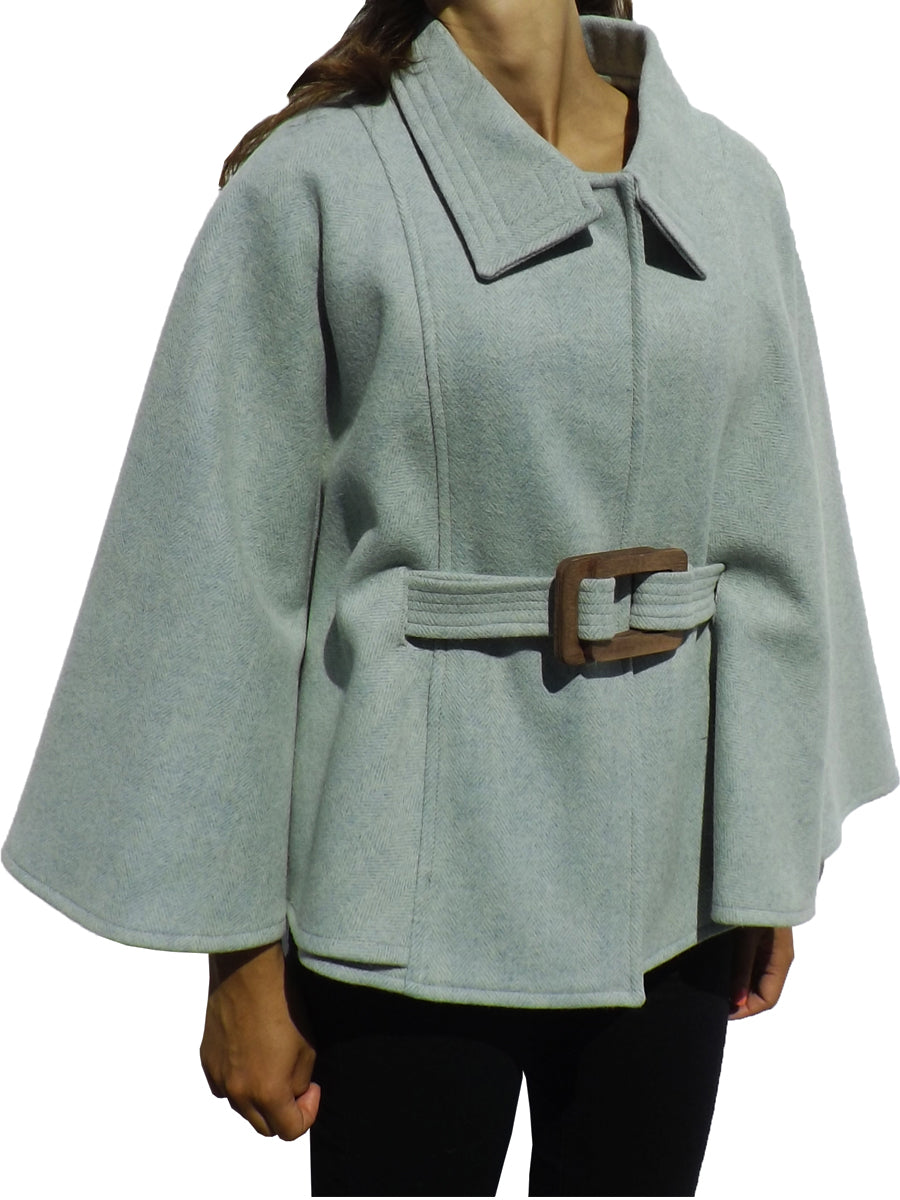 Capa curta confecionada em burel. Manga longa. Fecha com molas ocultas. Cinto ajustável.