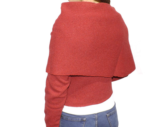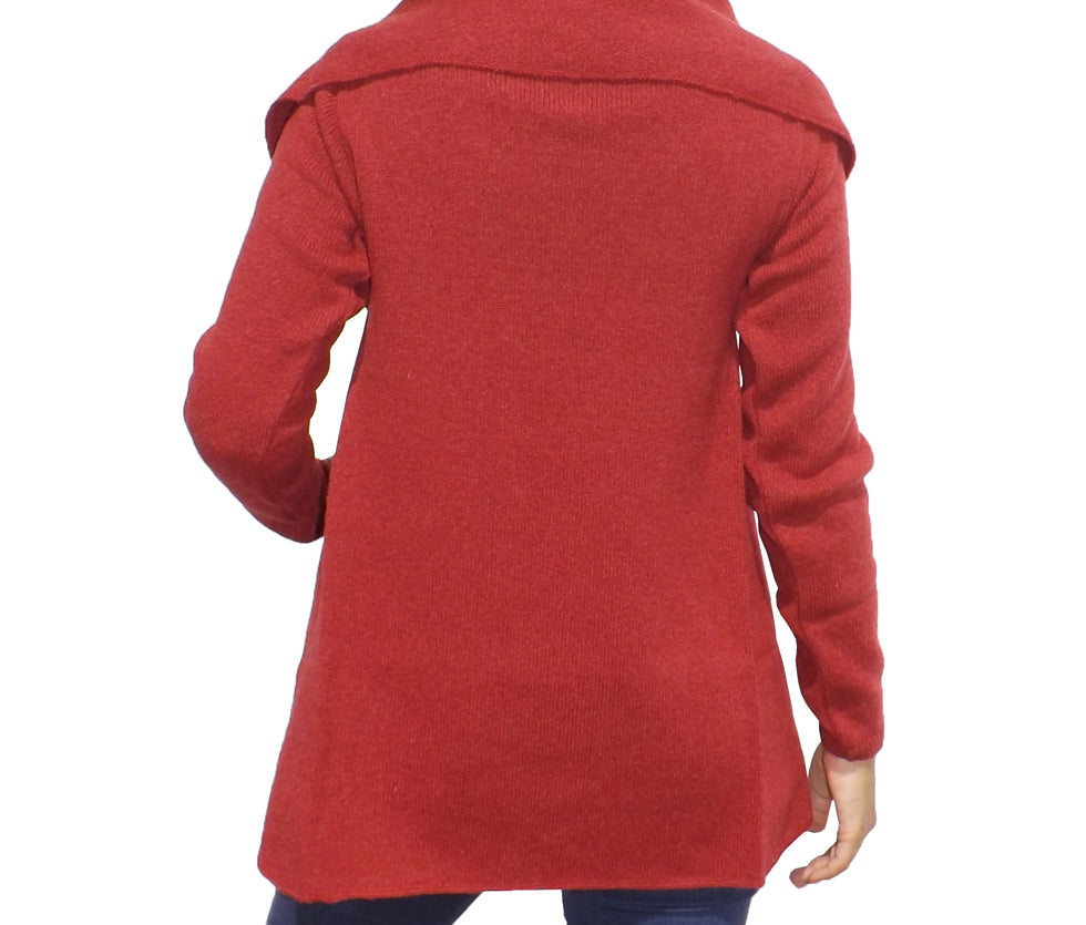 Casaco de malha 100% lã de ovelha. Muito versátil, 2 em 1, podendo ser usado comprido ou curto. Aberto, com a possibilidade de conceber diferentes tipos de gola com a ajuda de uma pregadeira.