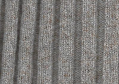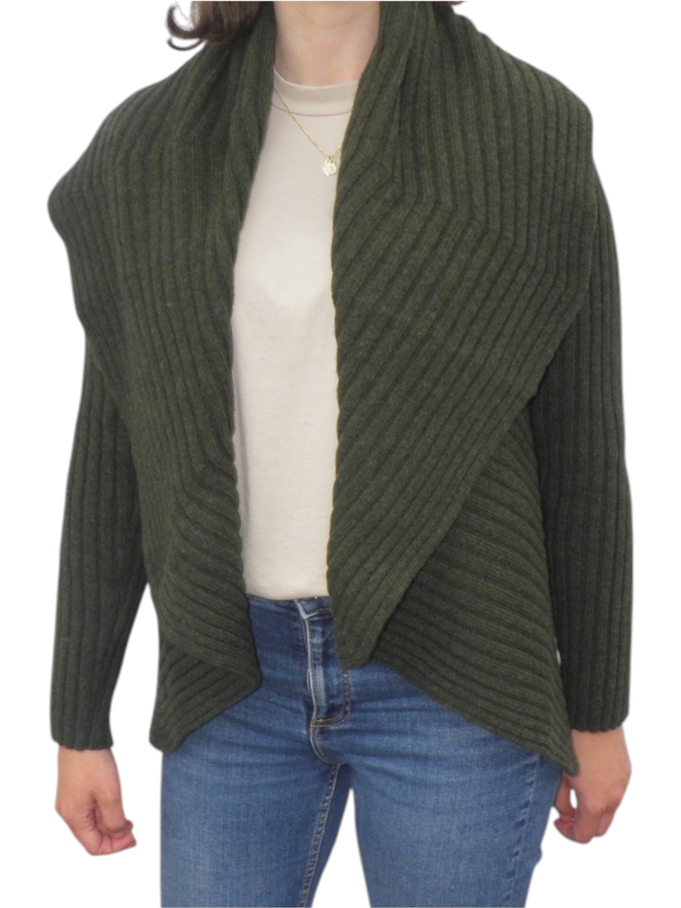 Casaco de malha canelada 100% lã de ovelha. Forma redonda possibilitando mais de cinco modelos diferentes com ou sem a utilização de uma pregadeira ou cinto.